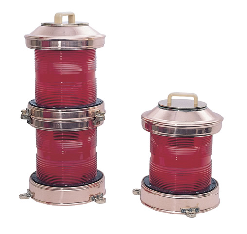 Bakırdan mamül, kırmızı akrilik, optik camlı. 3 milden görünür. Dikey flamanlı ampul 220V. 65W / 24V. 40W