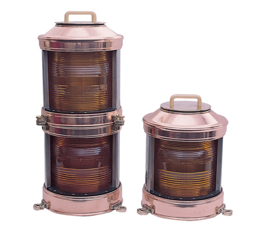 Bakırdan mamül,sarı akrilik,optik camlı. 3 milden görünür. Dikey flamanlı ampul 220V. 65W / 24V. 40W