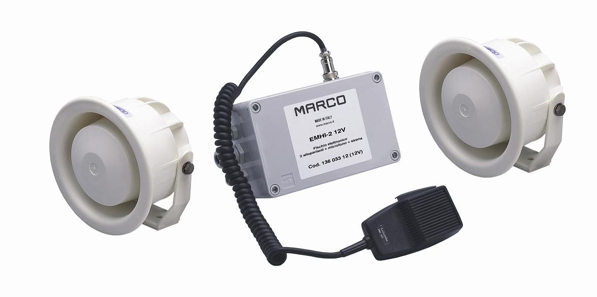 Su geçirmez çiftli elektronik megafon gömülebilir modeldir. Beyaz boyalı braketli ,siyah mikrofonlu ve elektrik ünitelidir. Bu ünitenin korna fonksiyonlu otomatik sis sinyali ,dört farklı şekilde acil yardım sinyali, çift aux girişi (VHF ve stereo), mikrofon özelliği vardır.Yarış tekneleri, feribotlar, polis ve petrol tekneleri için uygundur. Bu fonksiyonları sayesinde sisli hava şartlarında dikkat çekmek, yıkama sırasında liman ile haberleşmek, teknelerin yanına gelirken haberleşmek ve müzik dinlemek için uygundur.