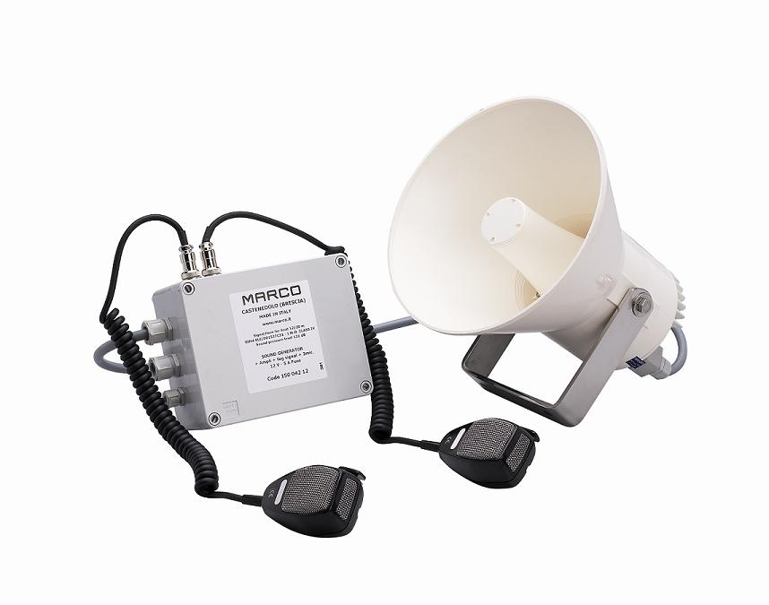 Sesi onaylı megafonlar kontrol kutusu ve çift mikrofonu ile birliktedir. Kontrol kutusunun özelliği 675 Hz frekanslı jenaratörlü, class A/B sesli anfisi, otomatik veya kişiye özel sis sinyalli ve aux girişli olmasıdır. Akustik zar performansını geliştirmek amacıyla yeni ultrasonik ısı sistemi kullanılmıştır. Montaj aksesuarları dahildir. COLREG 1972 IMO Class IV `e göre düzenlenmiştir. RINA, LLOYD`S REGISTER MCA, BUREAU VERITAS, NMA ve BSH tip onaylıdır.