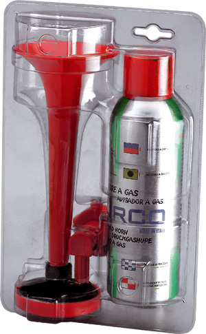 Gazlı korna. Plastik borulu ve paslanmaz çelik şişelidir. 200ml kapasiteli şişe yanmaz gaz içermektedir.