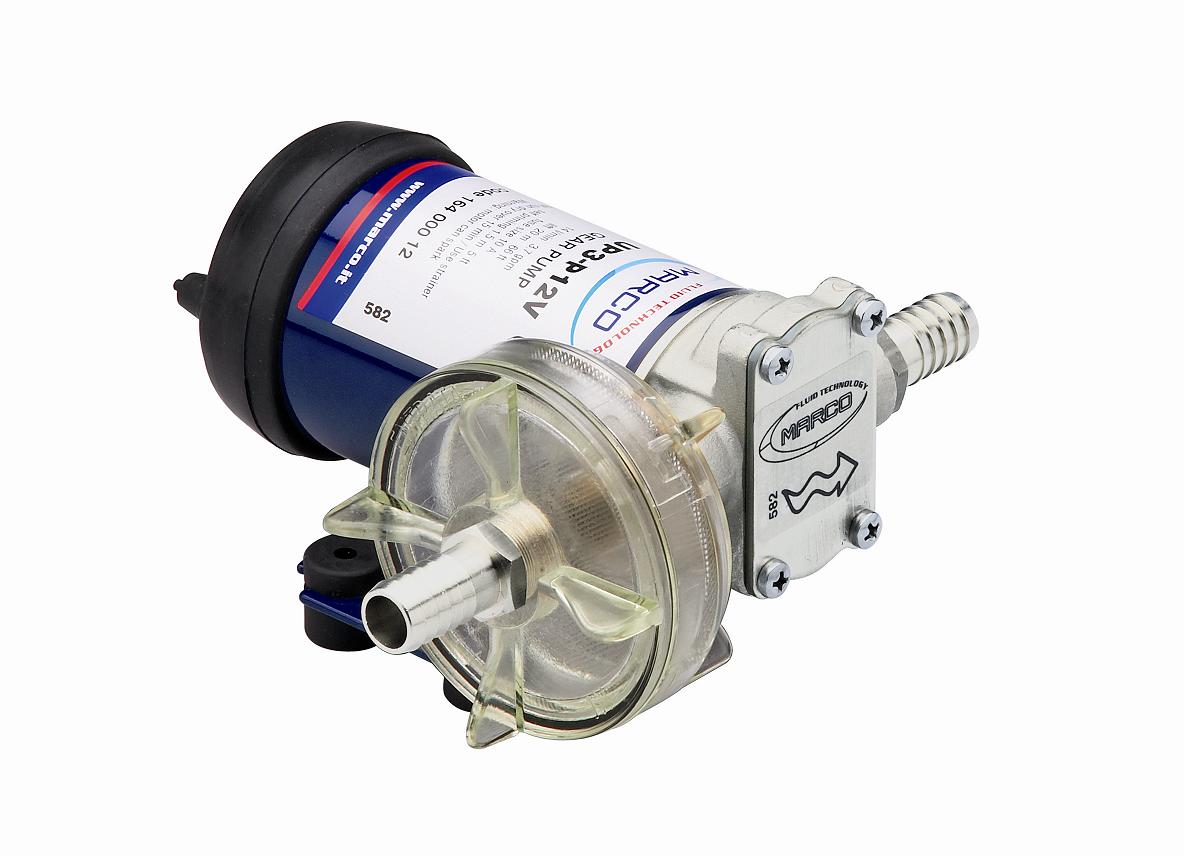 Sintine ve su transfer pompası. Elektirikli pompa helis dişli ve filitrelidir. Pompanın gövdesi pirinç üzerine nikel kaplama olup şaftı paslanmaz çeliktendir. 14mm olan iç boru çapı için 3/8`` kalınlığındaki pirinç bağlantılar kullanılabilir. Akış hızı: 14 lt/dk. Ölçüleri: 163x166x95