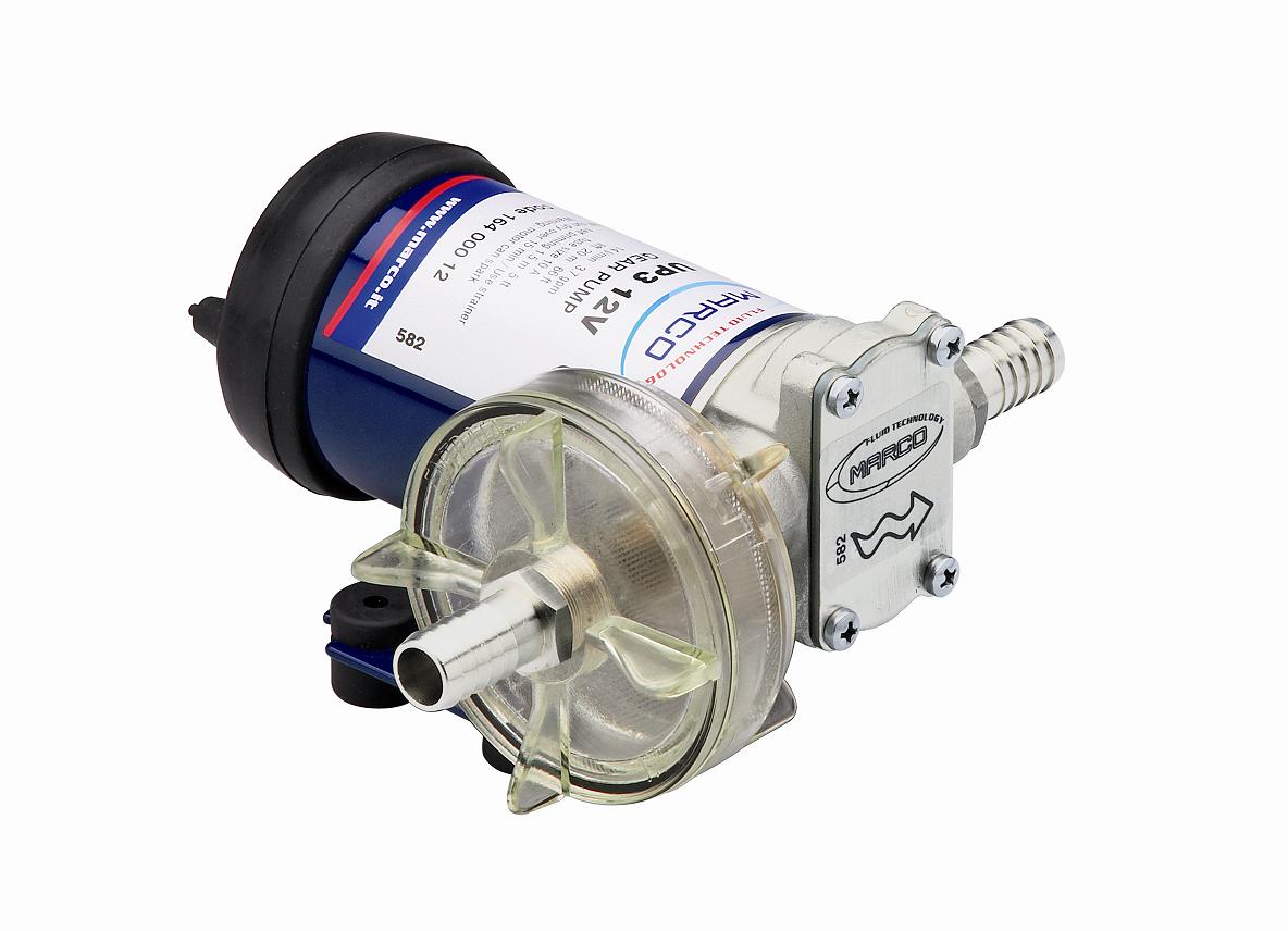 Yakıt ve su transfer pompası farklı nitelikteki sıvıların transferinde kullanılması için bronz dişli ve filitrelidir. Pirinç gövdeli olup şaftı paslanmaz çeliktendir. 14mm olan iç boru çapı için 3/8`` kalınlığındaki pirinç bağlantılar kullanılabilir. Dizel yakıt ve antifiriz transferinde kullanılır. Akış hızı: 14 lt/dk. Ölçüleri : 163x166x95