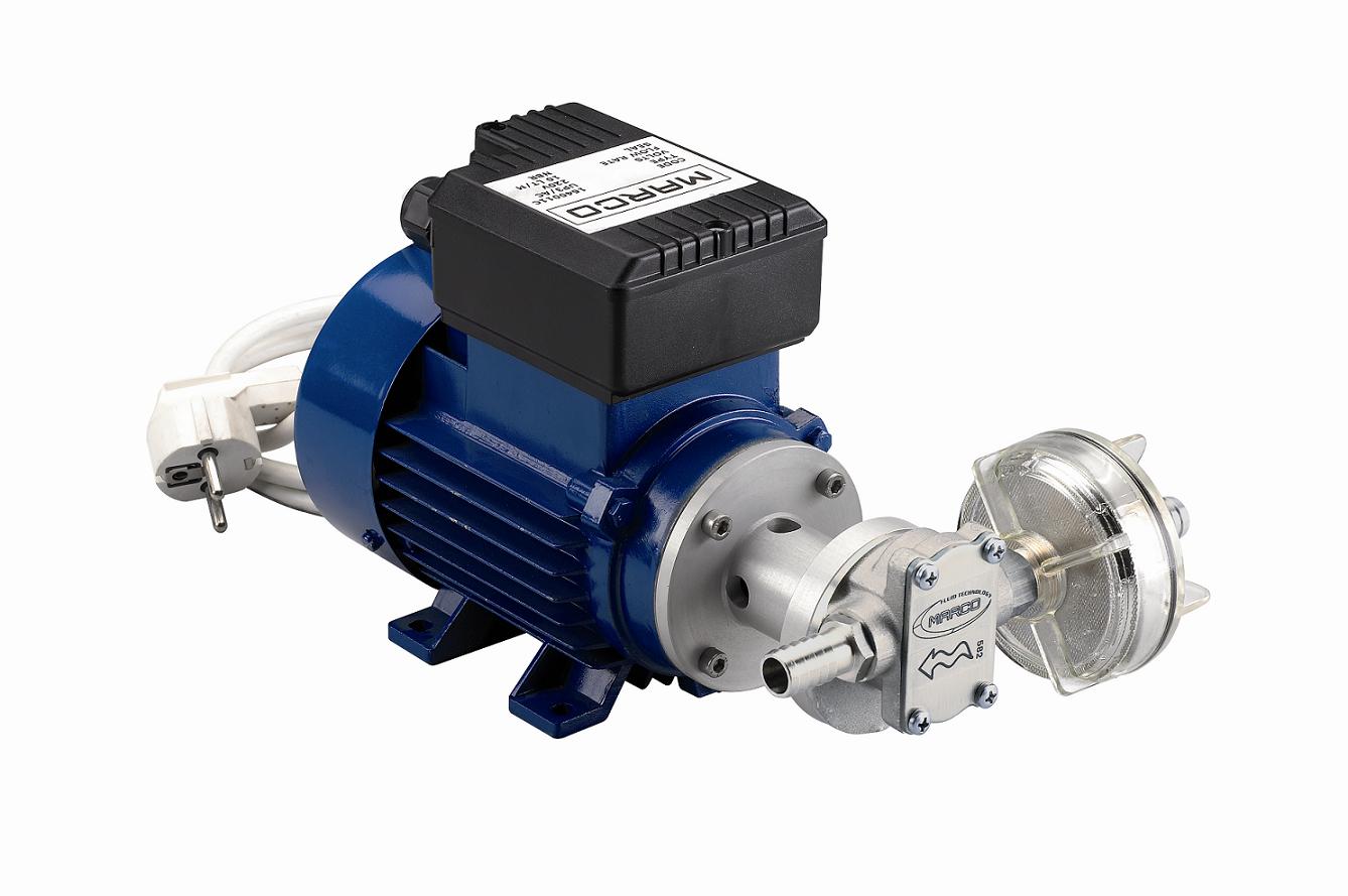 Elektirikli pompa su , yakıt ve kalın yağların transferinde ve kit kullanılarak motor haznesinin boşaltılmasında kullanılır. Pirinç gövdeli, bronz dişli, filitreli ve şaftı AISI 303 paslanmaz çeliktendir. 14mm olan boru çapı için 3/8`` kalınlığında bağlantılar kullanılabilir. Akış hızı: 10L/dk. Ölçüleri: 279x166x162